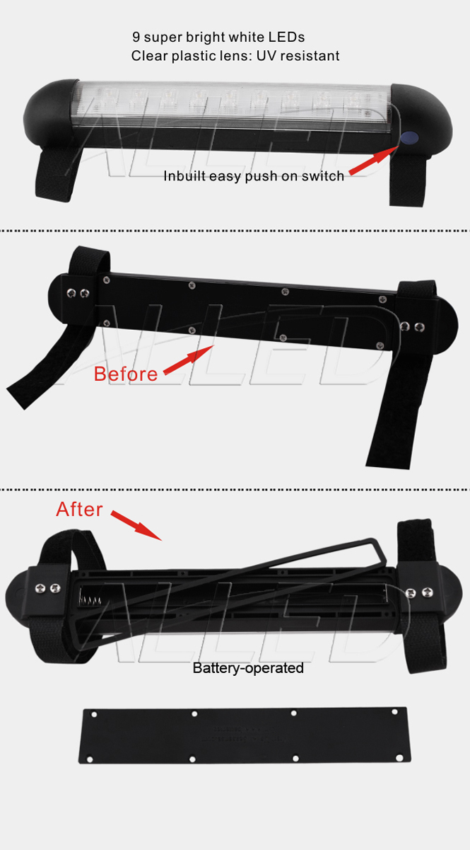 •9 super bright LEDs •Lighting color: cool white •Clear plastic lens: UV resistant •Produce virtually no heat •Inbuilt easy push on switch •Durable and 100% sealed design:dust-proof and damp-proof and vibration(do not use for rainy days) •Uses three AAA batteries (not included) •Extremely easy to install with hook & loop straps •Weight: 90g •Length: 203mm, width: 26mm, depth: 26.7mm
