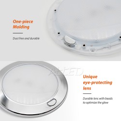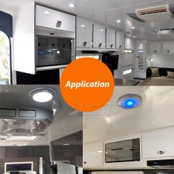 This LED Ceiling Downlight serves as an energy-efficient interior lighting solution for recreational vehicles including RVs, campers, motorhomes, and caravans. Featuring high-quality LEDs, this fixture delivers intense brightness while incorporating an innovative heat dissipation design that ensures stable performance. A dual-mode switching system allows seamless adjustment between blue ambient lighting and cool white illumination to accommodate various lighting requirements. Its ultra-slim profile enables installation in spatially constrained environments, complemented by surface-mounted technology that simplifies the mounting process through tool-free assembly. The combination of compact dimensions (merely 0.8" in height) and advanced thermal management makes this downlight both space-efficient and durable for mobile living applications.