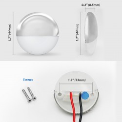 • 3 High quality LEDs • Lighting color: warm white • Operating voltage: 12V DC, tested to 13.8V • Low power consumption: 0.2W, 0.018A • Chrome plate (316SS)housing • Clear PC lens, plastic cover in Chrome Plated • Waterproof rating: IP66 • Circuit board completely sealed in epoxy to resist water, corrosion and vibration • Extremely Lightweight • Twin core lead wire tail • Long life span reaches 100,000hrs • Easy installation & use: Surface mounted • Weight: 15g • Diameter:φ 44*8.5mm, two screws holes distance: between 29-33mm