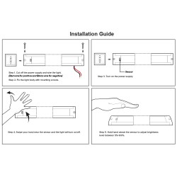 • Operating voltage: 12V DC • Low power consumption: 0.43A, 5.5W • Lighting colour: cool white • Luminous flux: 330lm • Stepless dim, hold hand above to dimmer btw 5%- 100% • Shell colour: White&Silver • Extremely great light output, excellent light uniformity • Touch-free and on/off function: It detects objects, such as you r hand within 50mm of the sensor on the front of the unit. A quick swipe over the sensor will trun the swich on or off. • Stainless mounting clips • Efficient heat dissipation, aluminum heat sink for long diode life. • Long life span reaches 50,000hrs • Weight: 95g • Length: 220mm, width: 48mm, depth: 9mm