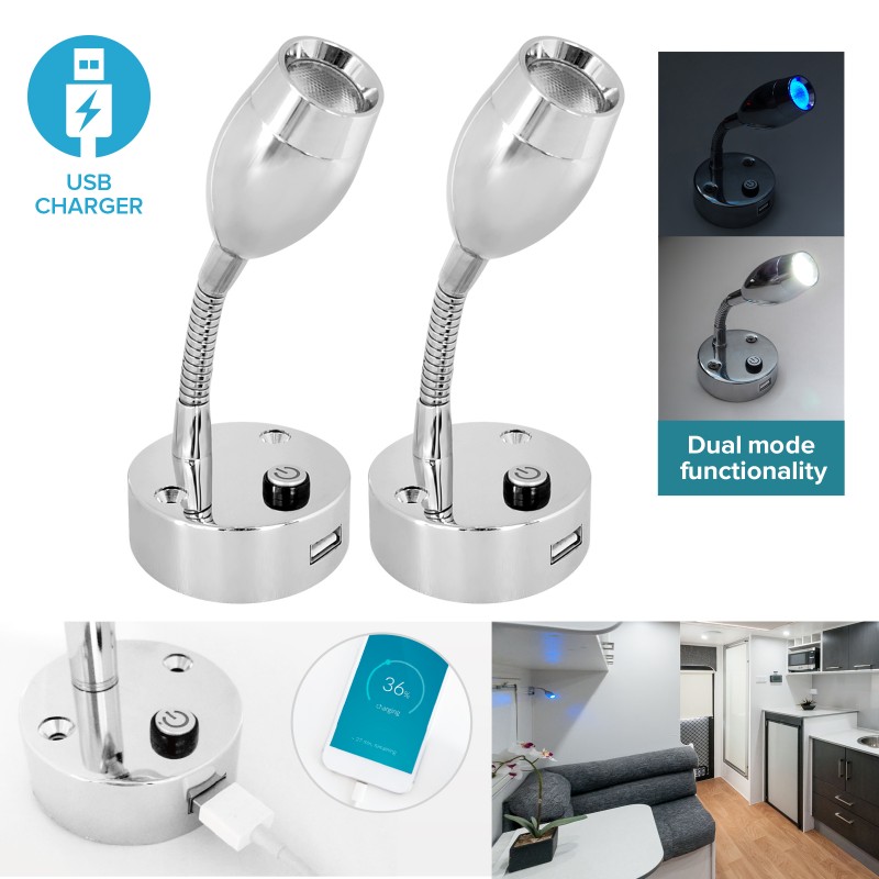 2 * 12V Cool White/Blue LED Flexible Bullet Shaped Reading Light with USB Charging Port